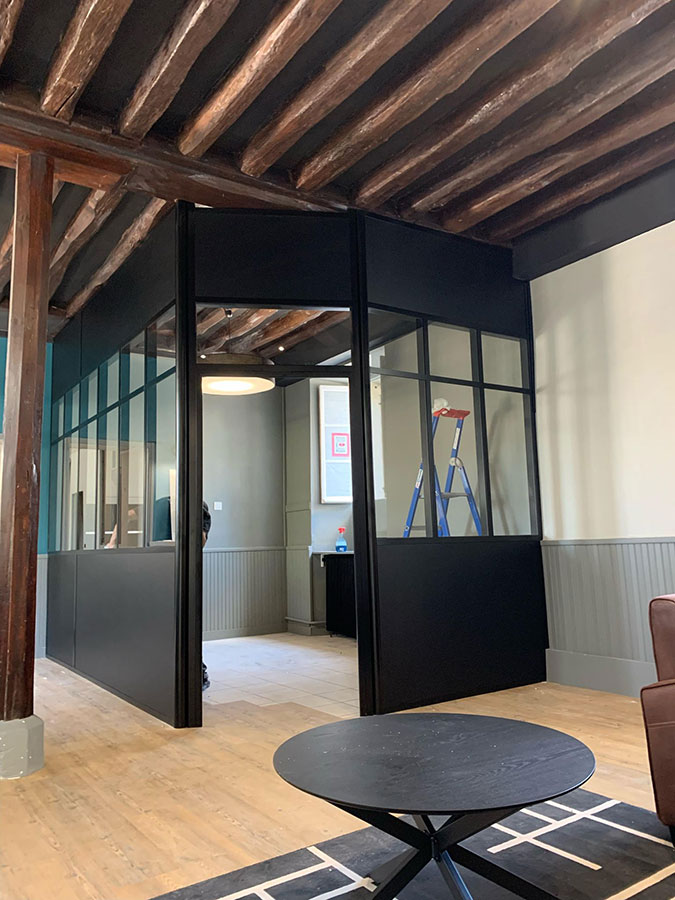 Ici l’objectif était clair : il fallait cloisonner un espace de bureaux situé en rez-de-chaussée, tout en respectant à la lettre la charte fixée par Plaza Immobilier. En effet, le siège imposait des cloisons de type atelier ainsi que le noir comme couleur principale. Les détails sont toujours bien définis quand il s’agit de franchises comme celle-ci. D’autant plus que les agences du réseau immobilier Stéphane Plaza sont bien imaginées. L’aménagement et l’ambiance sont pensés pour faire en sorte que le client oublie complètement qu’il se trouve dans une agence immobilière. Résultat : les bureaux ressemblent à des appartements à l’ambiance chaleureuse, un peu “comme chez soi”, d’où le choix judicieux de la cloison verrière d’atelier.