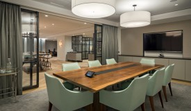 Une cloison vitrée bord à bord réunit les deux salles de réunion, elles-même ayant un regard réciproque sur l’autre grâce à des parois vitrées de chaque côté de la cloison pleine.