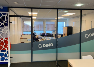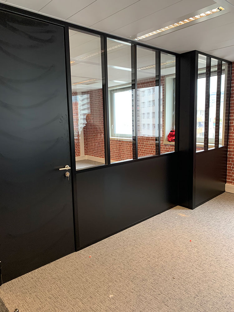 - Elle est personnalisable : panneaux, RAL Aluminium, vitrophanie, teinte des portes… Grâce à un large choix de personnalisation, vous pouvez créer le cloisonnement en cohérence avec l’image de votre entreprise.